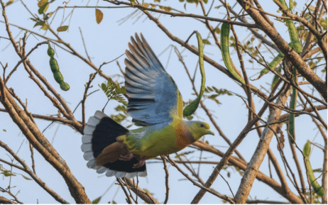 当橙胸绿鸠展翅翱翔,你的眼前又是一亮:它的翼下覆羽和胁部是一片天蓝色,仿佛把蓝天拥抱在了怀中;尾羽展开后显现出末端的一圈白色;尾下覆羽的橙红色也尽数展现。