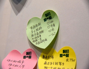 我们在一起,千言万语,汇聚成河,皆是对武大的爱与祝福。一叠叠整理好的便利贴拼凑成“WHU”(武汉大学)和一颗爱心,让我们将这份来自武大人的感动留存在心,将感动继续传递。